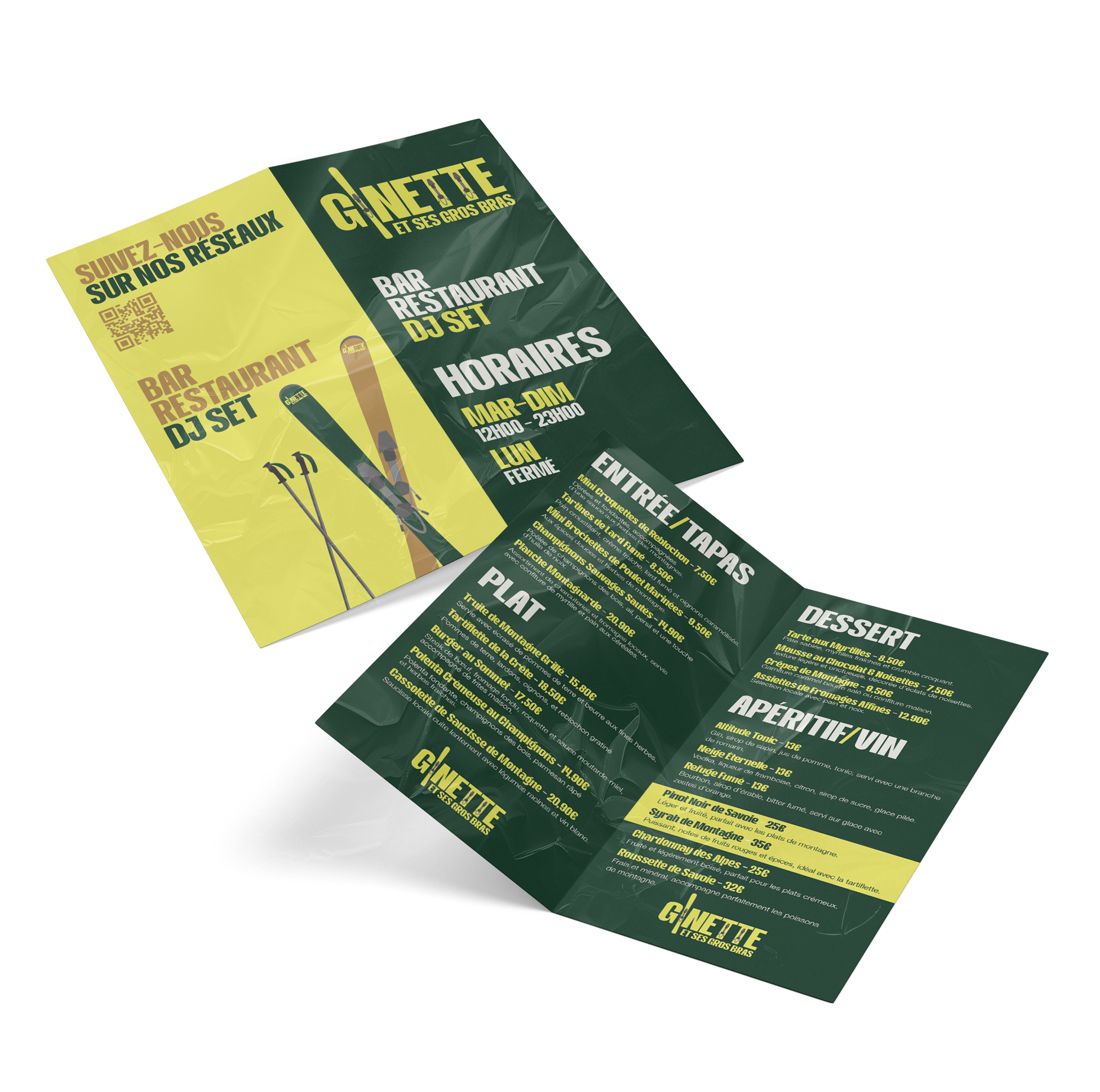 Conception de l'identité visuelle d'une table d'altitude. Le projet décline une esthétique contemporaine, subtilement infusée des codes de la montagne. L'univers graphique s'articule autour d'une palette chromatique chaleureuse et d'un patronyme singulier, portés par un slogan au ton affirmé. L'ensemble rend hommage à une figure féminine de caractère, indépendante et maîtresse des cimes.